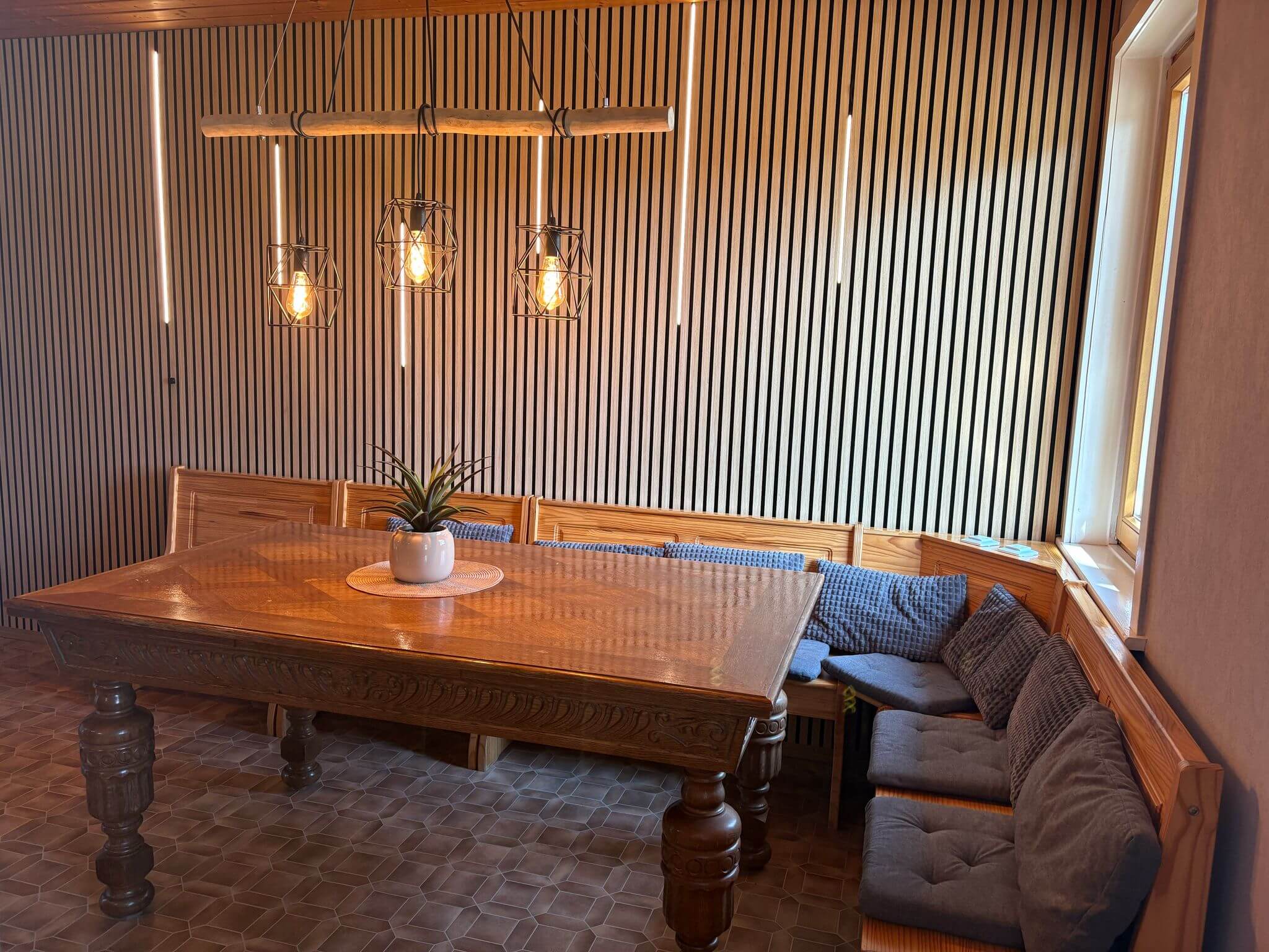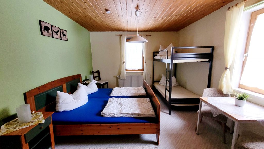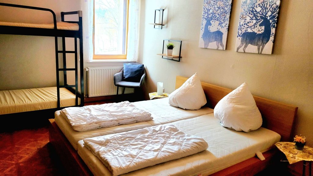 Die kleine Herberge hat 1 Doppelzimmer und 3 Mehrbettzimmer je 1 Doppelbett und 1 Etagenbett. Sie verfügt über eine Küche, eine Toilette, ein Bad mit Dusche und Toilette sowie ein breiter großer Gang der für Kinder zum spielen geeignet ist. Es gib auch eine Waschmaschine und Geschirrspülmaschine. Geschirr ist ausreichend vorhanden. Es kommt des öfteren vor, dass sich das Geschirr aus der kleinen Herberge in der Küche der großen Herberge befindet. Mieter von beiden Herberge nehmen es mit der Zuordnung nicht so genau. Das ist nicht weiter tragisch, Mieter von der kleinen Herberge bekommen ausreichend Geschirr dann wieder aus der großen Herberge.